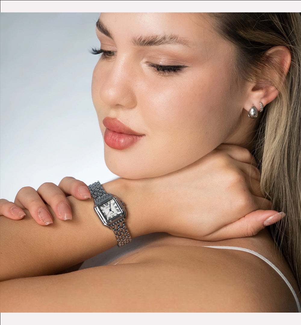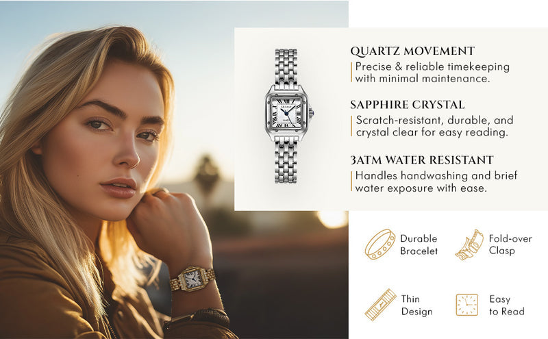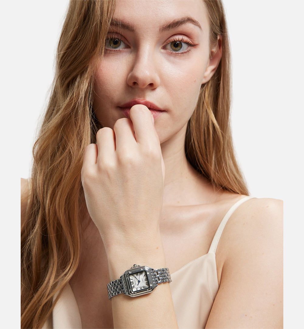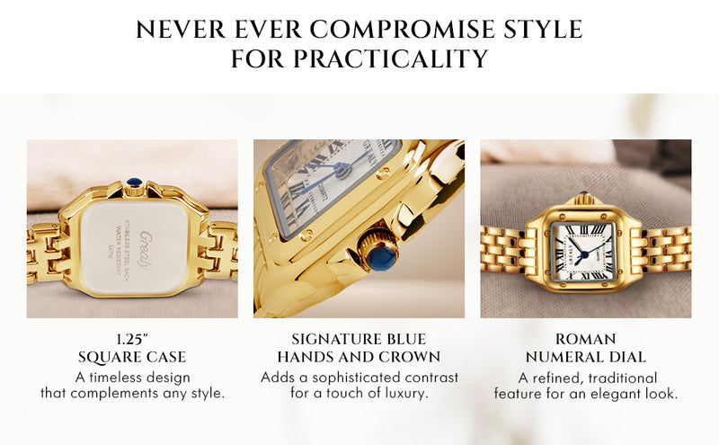 ● Classic square case with Roman numerals for a refined vintage look